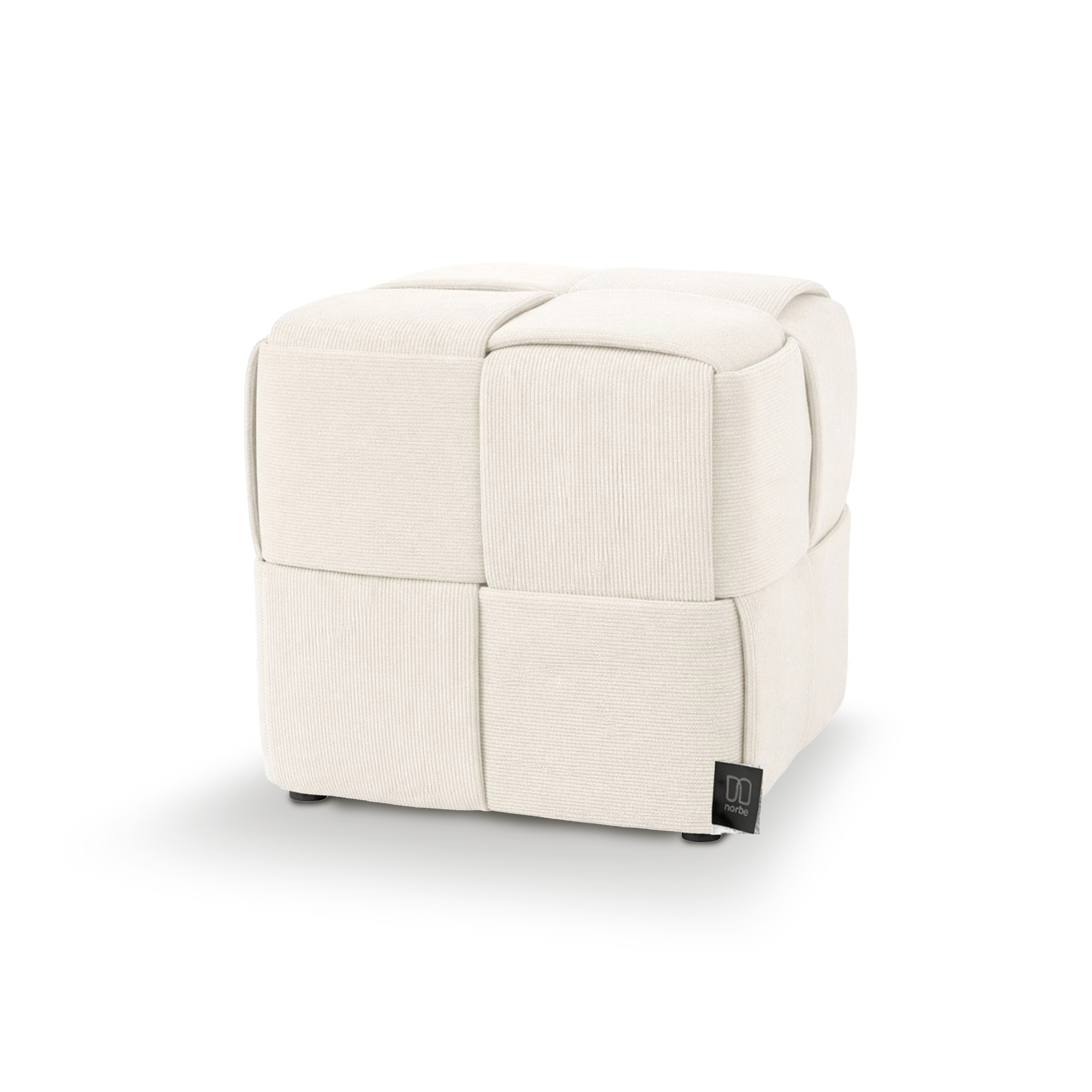 Il pouf imbottito Kuby si caratterizza per il suo design compatto e avvolgente, definito da volumi morbidi e da una raffinata lavorazione a riquadri. Il rivestimento in tessuto corduroy color bianco crema aggiunge una piacevole texture materica, capace di trasmettere calore e comfort visivo.