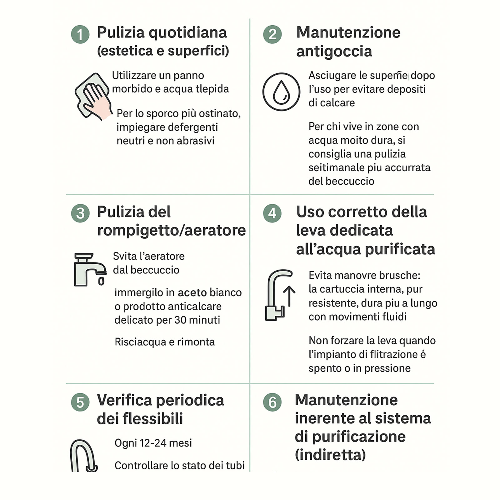 - Evitare assolutamente spugne abrasive, acidi o prodotti anti-calcare forti che possono danneggiare le finiture in cromo o nero opaco.