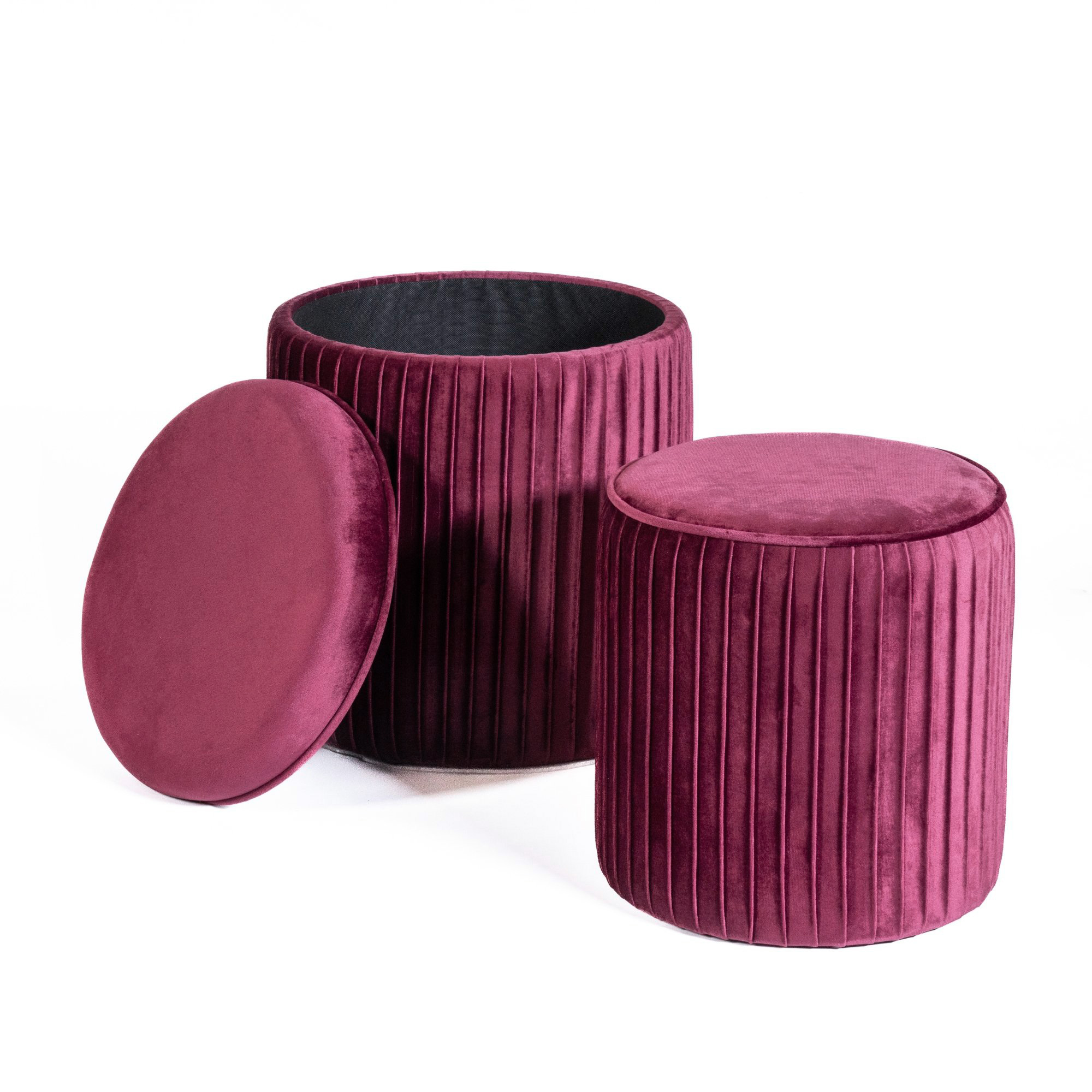 Raffinato, versatile e funzionale: il set di 2 pouf in velluto, composto da un pouf contenitore e un pouf poggiapiedi, è la soluzione ideale per arricchire qualsiasi ambiente con stile.